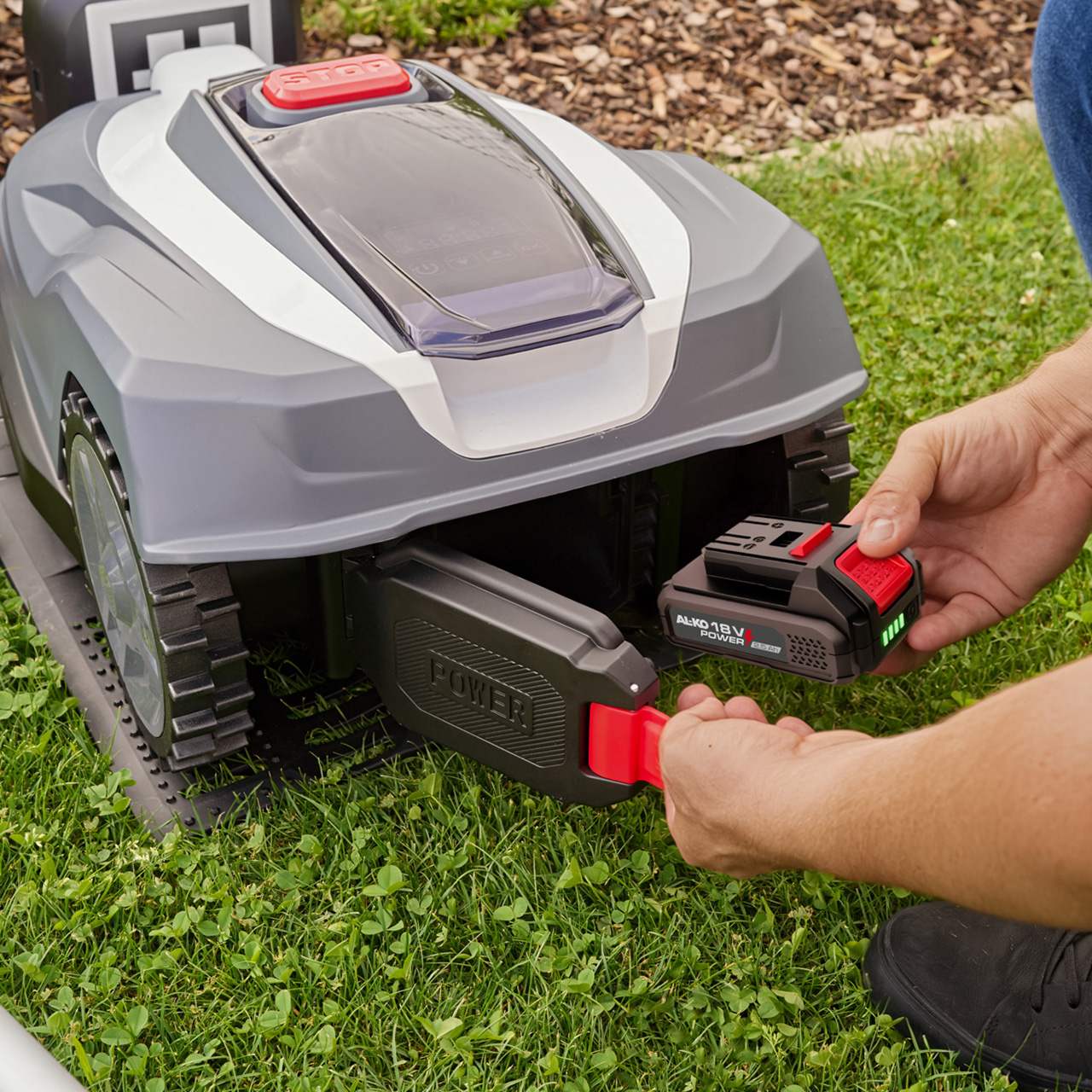 - Lako uklonjivi akumulator 18 V/36 V, 5,0 Ah/2,5 Ah, može se koristiti za rad kompatibilnih uređaja u AL-KO 18/36 V sustavu “1 Battery – 2 Voltages” tijekom pauza