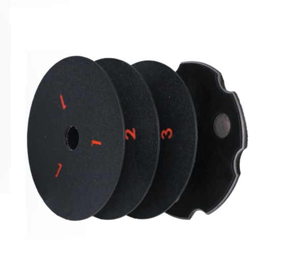 Set uključuje bazu i tri čelična držača za polirajuće diskove.